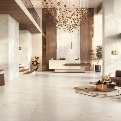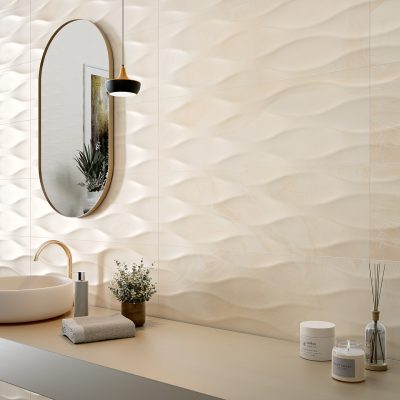 Die 3D-Dekore der Fliese zeichnen sich durch organische Formen aus, die dem Design eine subtile Tiefe und raffinierte Eleganz verleihen.