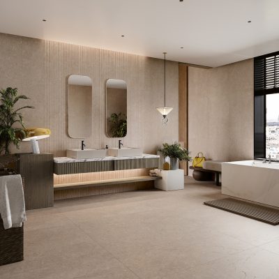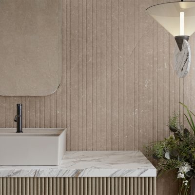 Le décor cannelé associe des lames de différentes largeurs dans un relief qui s’écoule avec élégance, évoquant le mouvement de l’eau. Une proposition polyvalente, idéale pour des intérieurs de caractère et des façades affirmées.